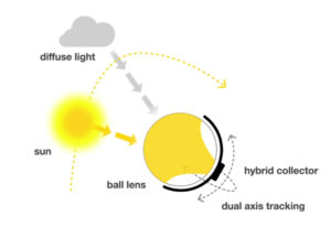 Companies like rawlemon are taking this issue seriously. Their approach uses spherical glass beads to focus a wide cone of sunlight down into an intense area: catching not only direct sunlight but surrounding diffuse light as well. This way, the solar panel itself can be much smaller; instead of re-angling a full solar panel to face the Sun, this small panel needs to move slightly throughout the day to follow the moving focal point of the glass bead. In essence, they face directly into the sun for as a long as possible.